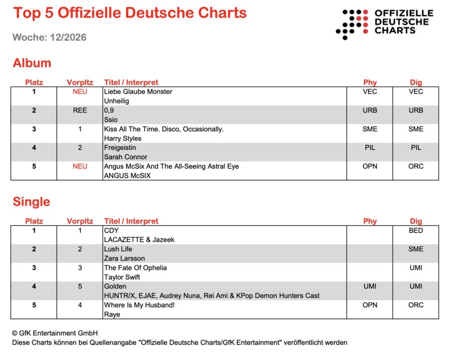 Die Offiziellen Deutschen Charts werden von GfK Entertainment im Auftrag des Bundesverbandes Musikindustrie (BVMI) ermittelt. Sie decken 90 Prozent aller Musikverkäufe ab und sind das zentrale Erfolgsbarometer für Industrie, Medien und Musikfans. Basis der Hitlisten sind die Verkaufs- bzw. Nutzungsdaten von ca. 2.600 Händlern/Filialen sämtlicher Absatzwege. Dazu zählen der stationäre Handel, E-Commerce-Anbieter, Download-Portale und Streaming-Plattformen.