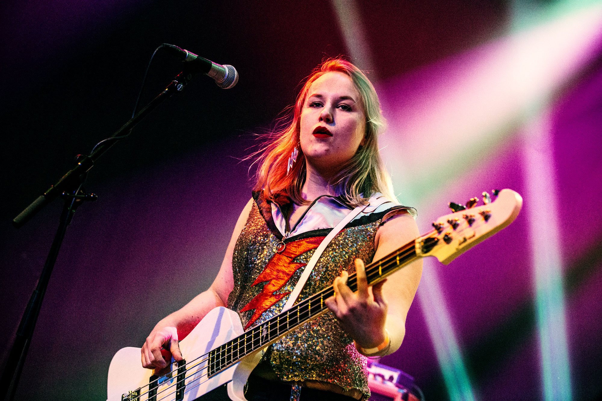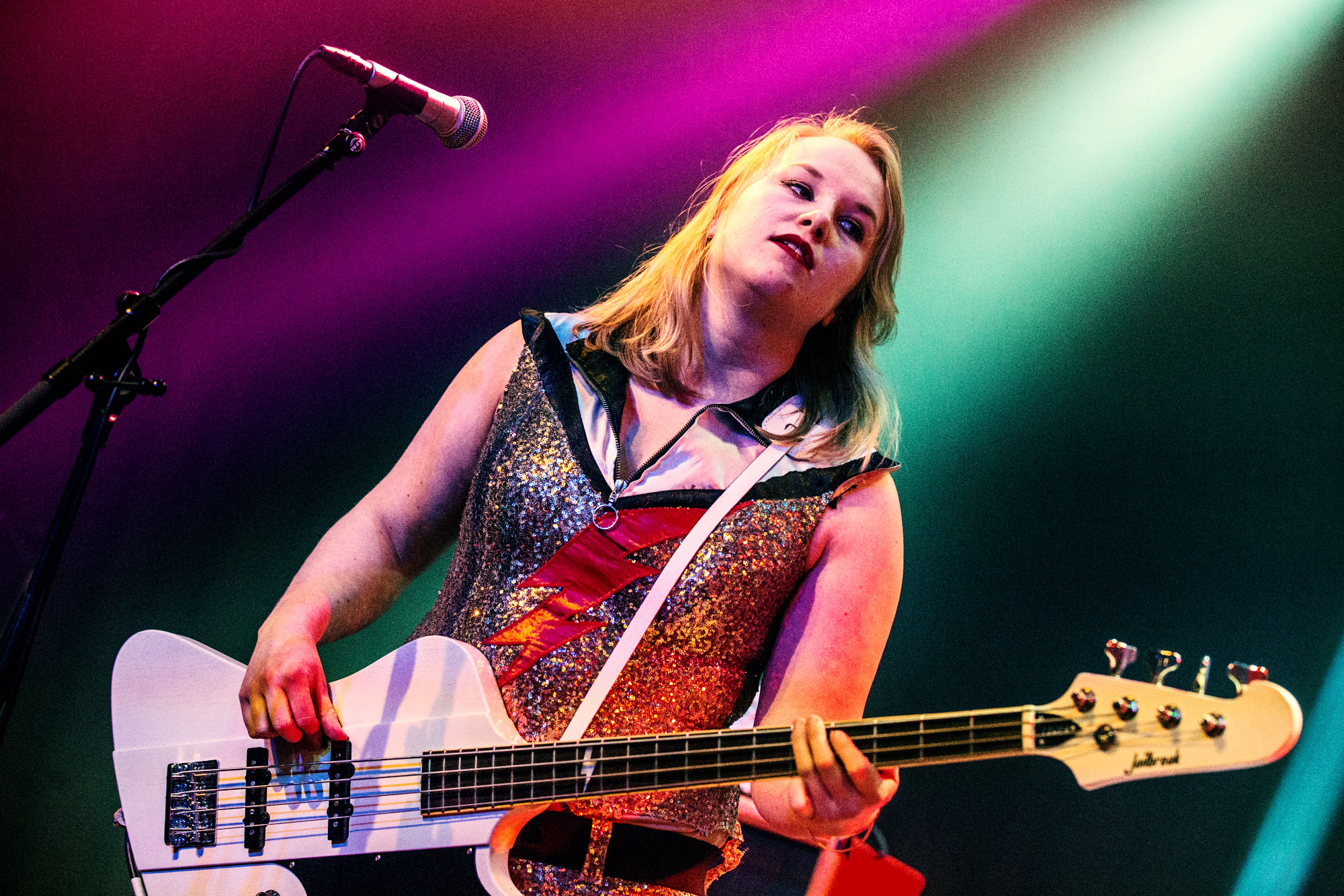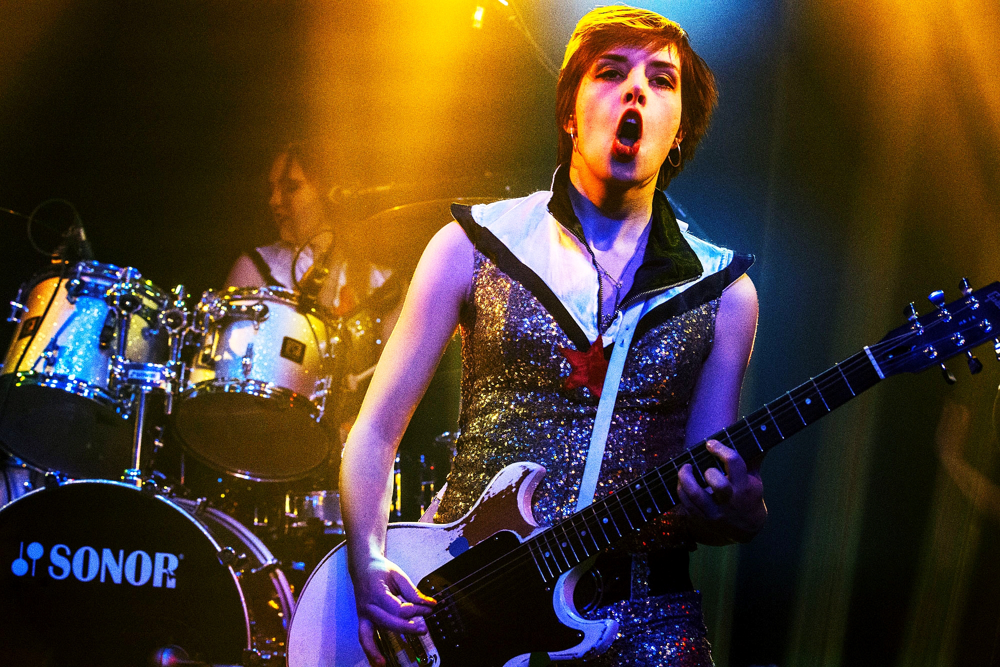 Das war ein enttäuschender Abschluss des Crossroads Festivals am Samstagabend – zumindest was den ersten Teil betrifft. Maja Linn Samuelsson (Sängerin und Gitarristin), Bassistin Sara Frendin und Schlagzeugerin Astrid Carsbring kommen in goldenem Goldglitteroutfit auf die Bühne. Man merkt den jungen Frauen von Heavy Tiger die Nervosität an, und das Publikum feuert sie fair an. „Saigon Kiss“ wirkt gewollt hart, „Feline Feeling“ bleibt an der harmlosen Oberfläche. Bei „Superstar“ funkelt ein wenig Grunge und Samuelssons Gesang wird etwas rotziger.