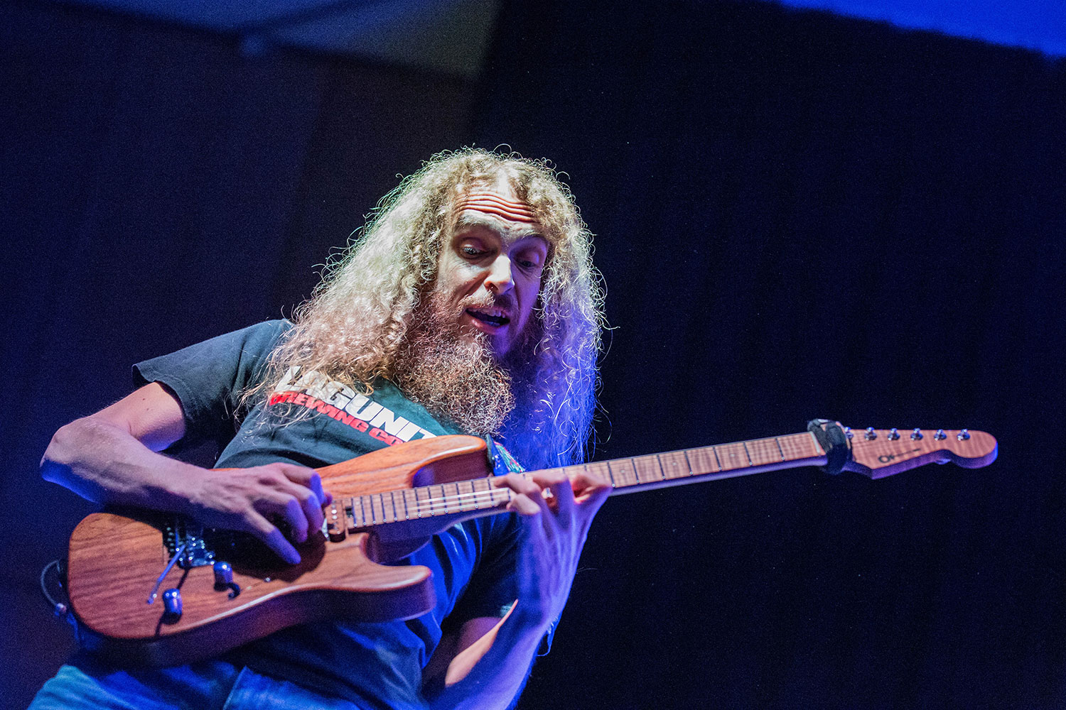 Nach drei Stunden stehen sie dann alle vereint auf der Bühne. Klar ist es faszinierend zu sehen, wie traumwandlerisch die drei durch die Harmonien flitzen, wie sie zwischen Blues-Pentatoniken, lydischen und mixolydischen Modi wechseln. Flockenzarte Klänge, artificial Harmonics, einstreut wie Puderzucker auf den Nachschlag.