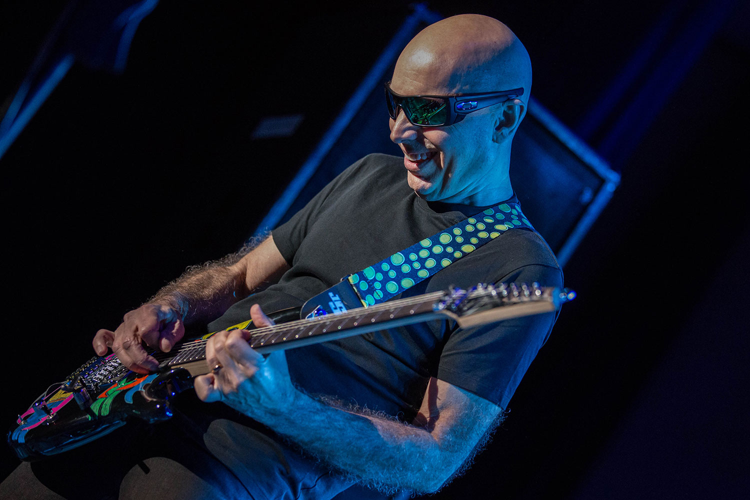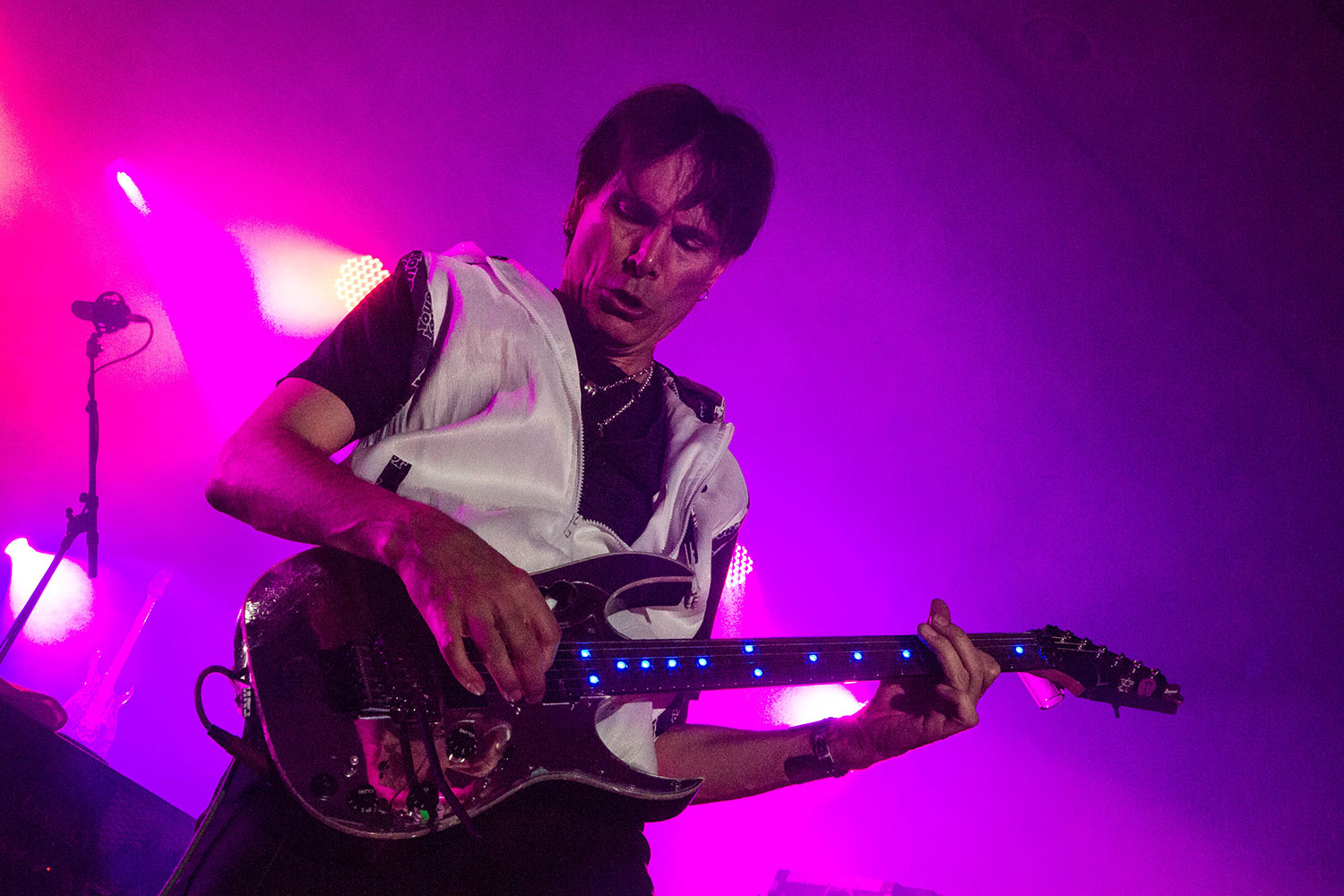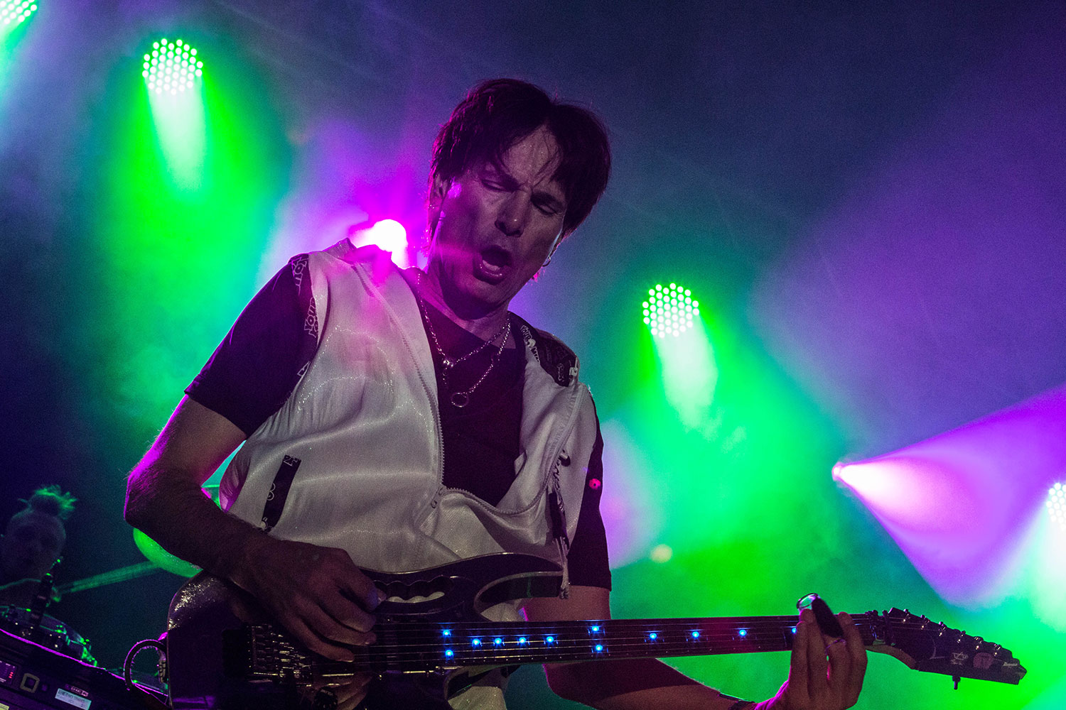 Joe Satriani startet sein Set tatsächlich mit dem Titelstück seines aktuellen Albums „Shockwave Supernova“, entführte die Fans aber sogleich nicht nur visuell durch ein Wurmloch in seine Vergangenheit: Der Mann sieht tatsächlich aus wie immer. „Flying in a Blue Dream“, „Ice 9“ und das Titelstück aus dem nach wie vor erfolgreichsten Rock-Instrumental-Album „Surfing with the Alien“ aus dem Jahr 1987. Eric Clapton is God, hieß es mal. Satriani will lieber ein Alien vom anderen Stern sein, wie er da mit seiner ameisenaugenhaften Sonnenbrille auf der Bühne steht.