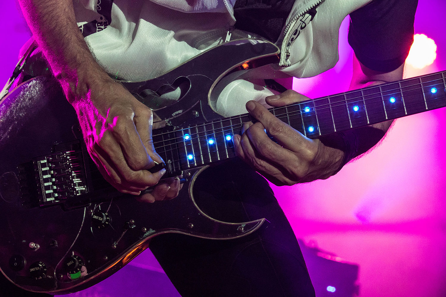 Steve Vai, 56, kommt mit blau leuchtender Gitarre und Scheinwerfer auf seiner Kapute auf die Bühne. Wie ein Wesen aus einem Star Wars-Film. Und dann krachen auch schon die festten Gitarrenriffs. Vai war nicht nur einst Schüler von Joe Satriani, 59, er war gerade 18 Jahre alt, als er von Frank Zappa als „Stuntgitarrist“ und gescheiter Musiktheoretiker entdeckt wurde. Während andere in seinem Alter die Lautsprecher aufdrehten, transkribierte Vai die irrwitzige Musik von Zappa und hielt sie auf hunderten von Notenblättern fest.