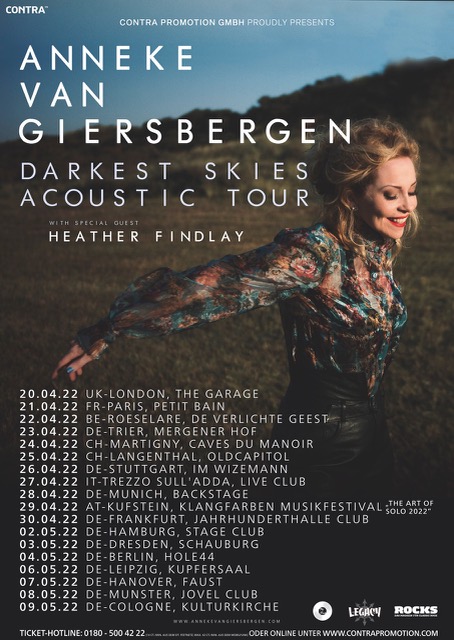 Die niederländische Sängerin, Songwriterin und Ausnahmekünstlerin Anneke van Giersbergen geht 2022 wieder auf große Tournee. Nach einer längeren pandemiebedingten Pause kehrt sie mit einer intimen, akustischen Solo-Tourzurück auf die Bühnen Europas. Anlass ist ihr vielfach gelobtes Album „The Darkest Skies Are The Brightest“, das im Februar 2021 erschienen ist.
