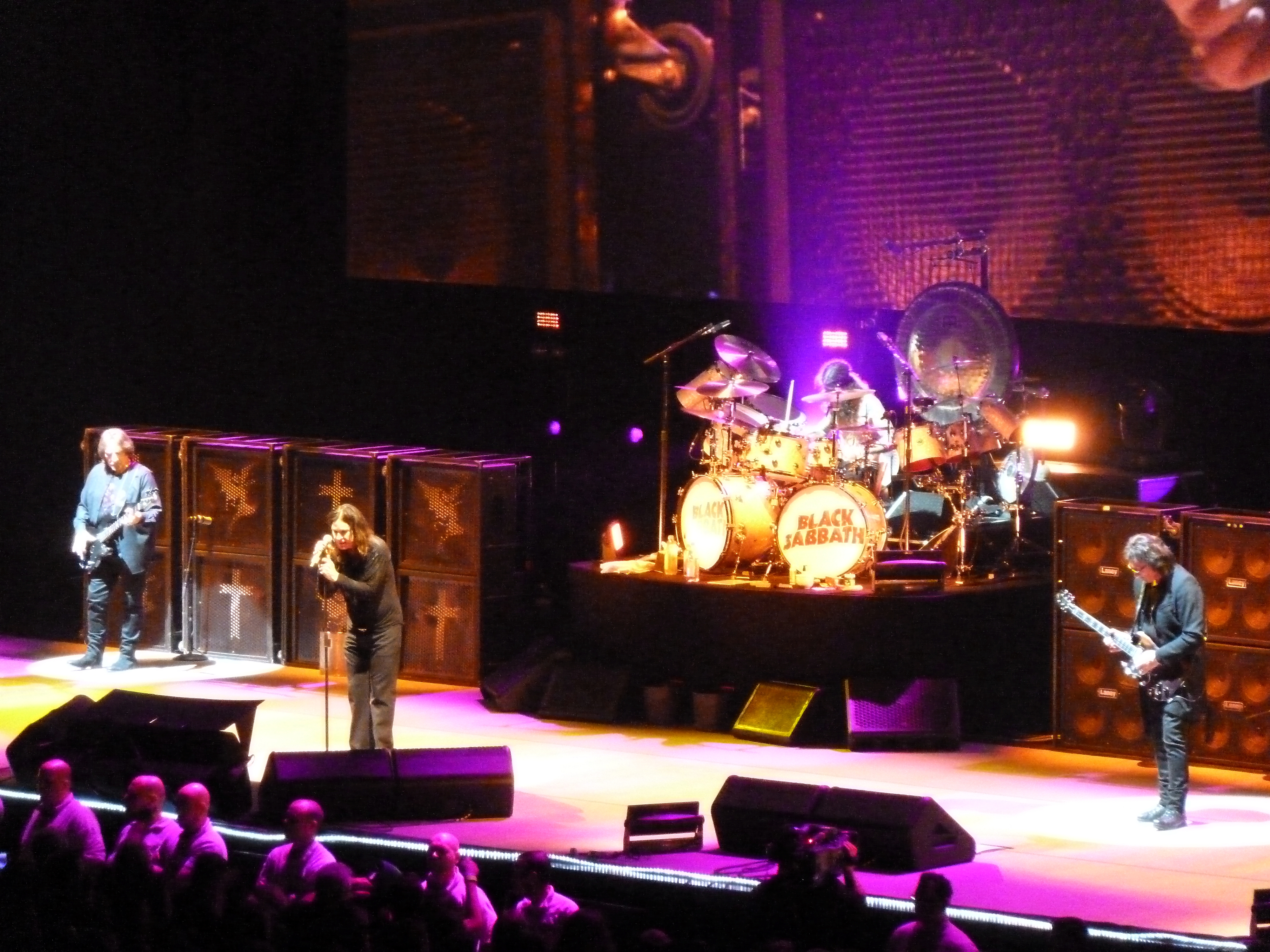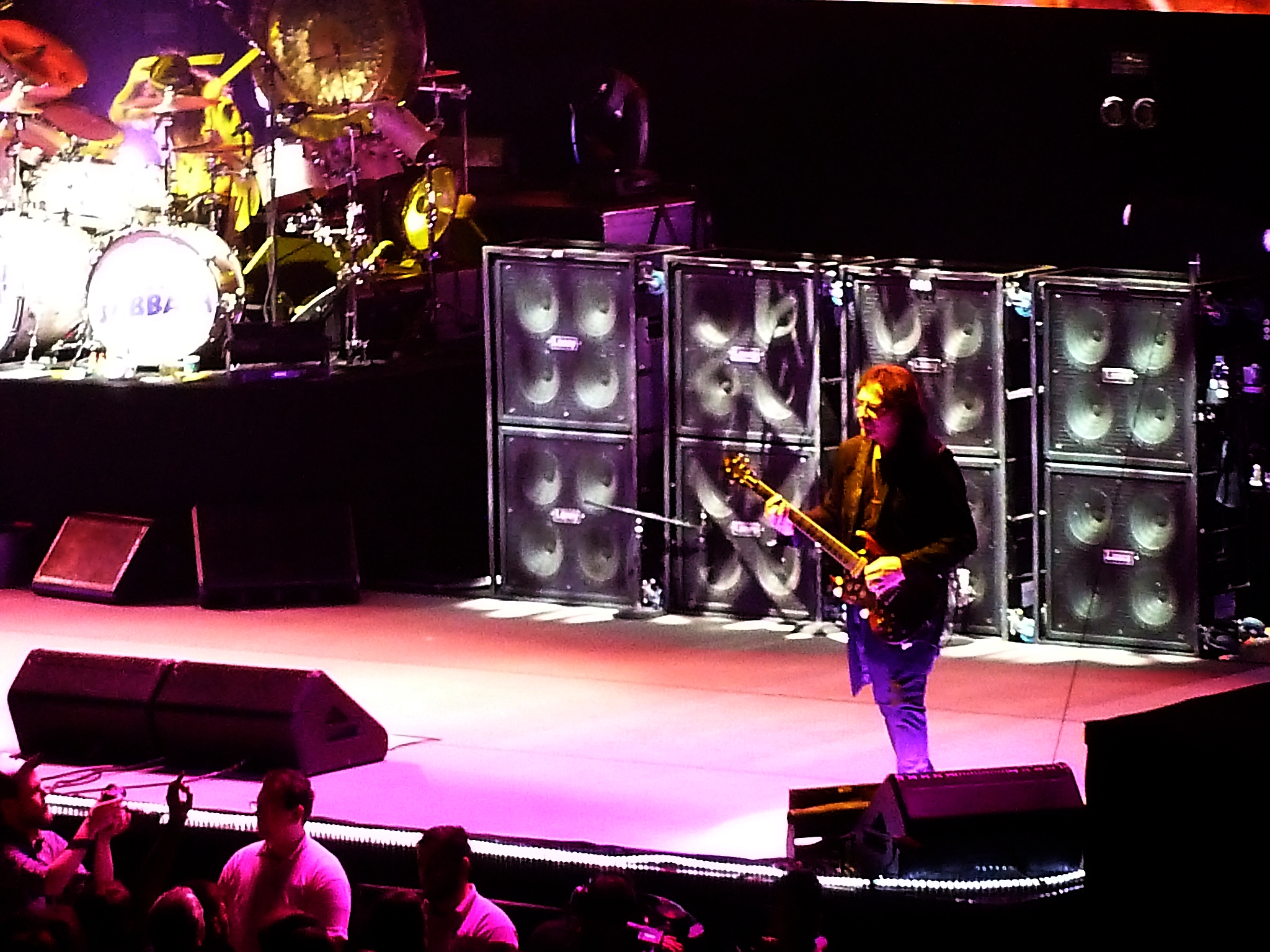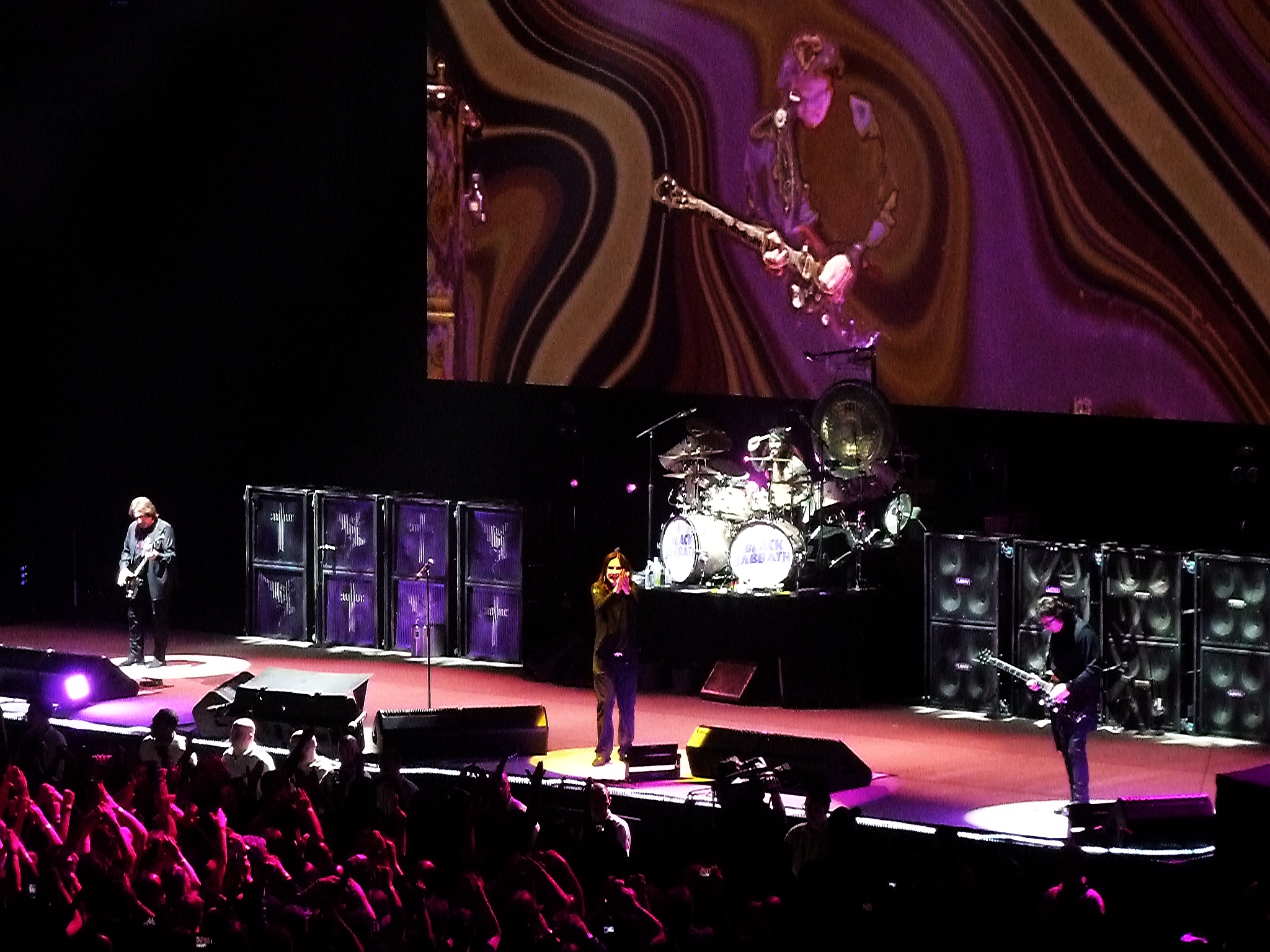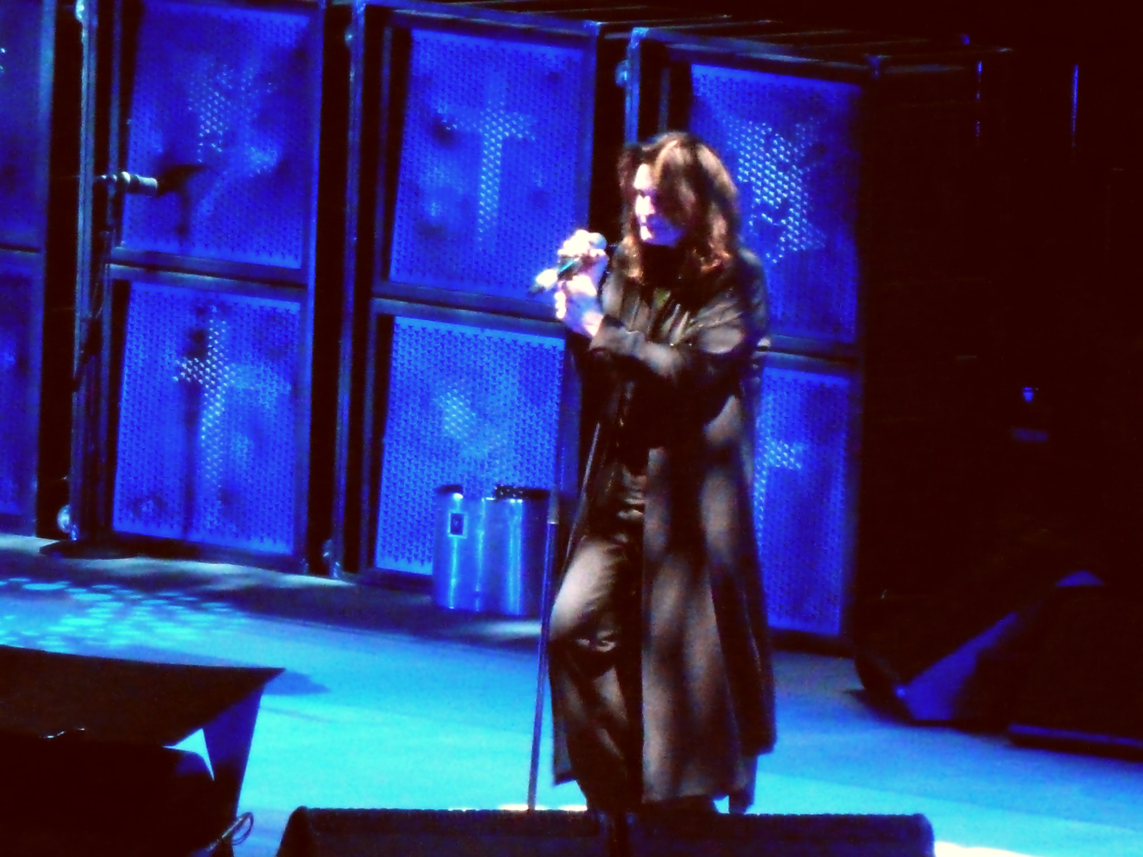 Nein, zum Abschied wird keiner Fledermaus der Kopf abgebissen, keine Taube live auf der Bühne geschlachtet. Die Zeiten sind für die Senioren des Heavy Metal längst vorbei. Ozzy bleibt meistens merkwürdig starr an seinem Mikro in der Bühnenmitte stehen, nur hin und wieder bewegt er sich mal links und rechts zur Bühne, feuert das Publikum an, kehrt dann aber zu seinen Gesangsparts immer wieder zu seinem Mikrofonständer zurück. Keine Ahnung, ob er seine Texte von Teleprompter abliest – das konnte ich von meinem Platz aus nicht sehen. Eigenartig ist aber schon, dass er die Augen merkwürdig starr auf einen Punkt gerichtet zu haben scheint, wie man bei den Nahaufnahmen auf der Leinwand sieht. Ob Ozzy, der an Dyslexie, also an Leseschwäche, und ADS leiden soll, tatsächlich abgelesen hat? Fakt ist, dass er schon mal erzählte, dass er sich immer nur wenige Minuten aufs Lesen konzentrieren könne. Wie auch immer, Ozzy scheint jedenfalls gehörig Spaß zu haben an den alten Sabbath-Songs.