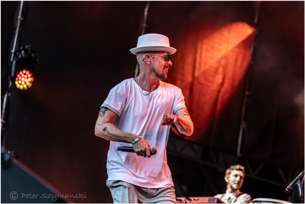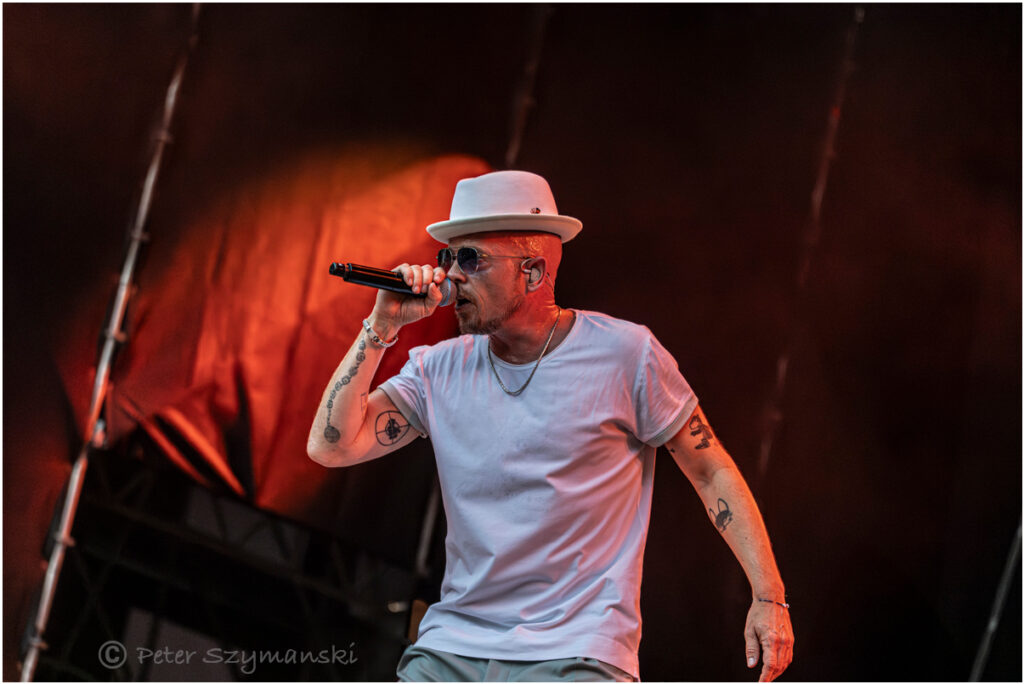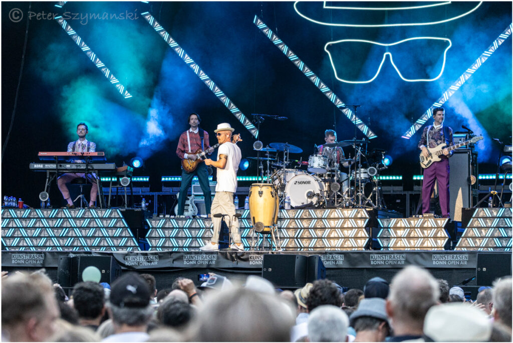 Erst einmal Respekt, Jan Delay! Bei gemessenen 35 Grad ist das T-Shirt schon nach gut fünf Minuten durchgeschwitzt, aber du ziehst durch. Gnadenlos. Zwei Stunden lang – ohne Kleidungswechsel. Der Mann mit dem weißen Hut und der grandiosen Band im Hintergrund brennt halt. Für seine Musik, für Disco, Soul, Funk, HipHop, für seine 8000 Fans auf dem Bonner KunstRasen – und kennt sich auch noch mit den kommunalpolitischen Gegebenheiten aus. Es stimmt, als er 2012 an diesem Platz aufgetreten ist, da konnte er von der Bühne aus auf den schönen Rhein und das Panorama des Siebengebirges blicken: „Heute steht da eine beschissene Mauer, und alles nur wegen einem A***loch, das vielen Leuten den Spaß verdirbt“, ruft er aus. Es war wieder ein Fest. Jan Delay is in the house….!!!