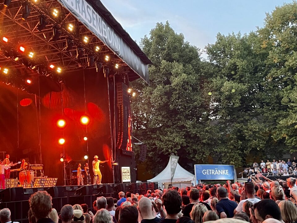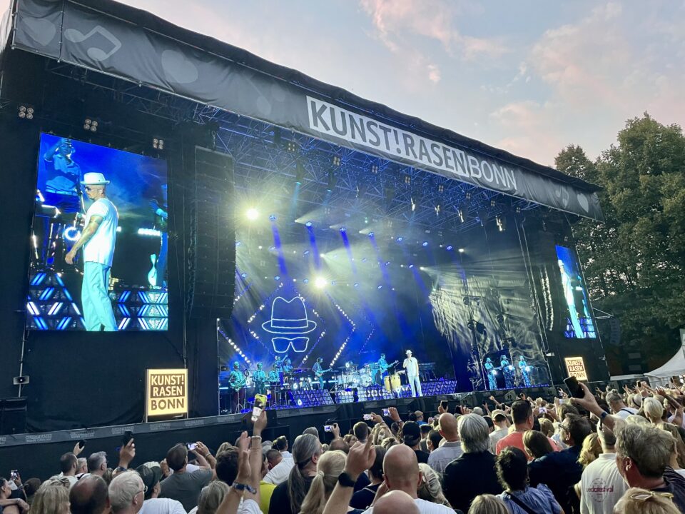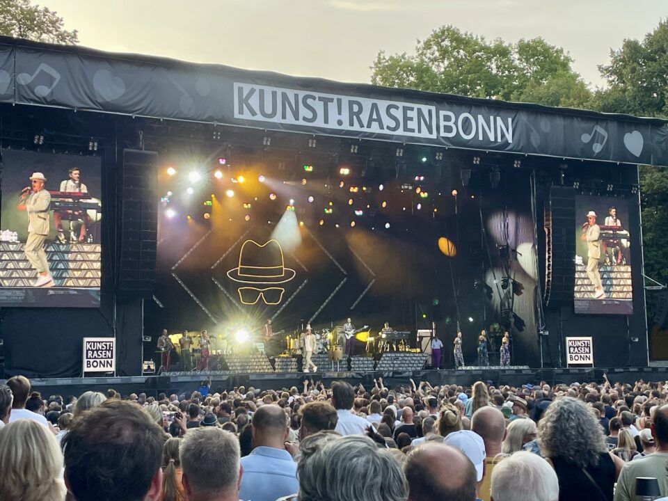 Dann der Moment der Wahl: Vor dem Reggae-getränkten „Wassermann“ (Jan Delay, Hammer & Michel, 2014) gibt er dem Publikum drei Optionen – „Ich möchte nicht, dass ihr meine Lieder singt“, „Wassermann“ oder „Vergiftet“. Der lauteste Applaus gilt eindeutig dem Wassermann, und so wippt der gesamte KunstRasen in einem sanften Offbeat – da wurde Bonn, diese Bundesstadt mit den starren Verwaltungsvorschriften für Konzerte und Spaß, für ein paar schöne Momente zur karibischen Hafenstadt.