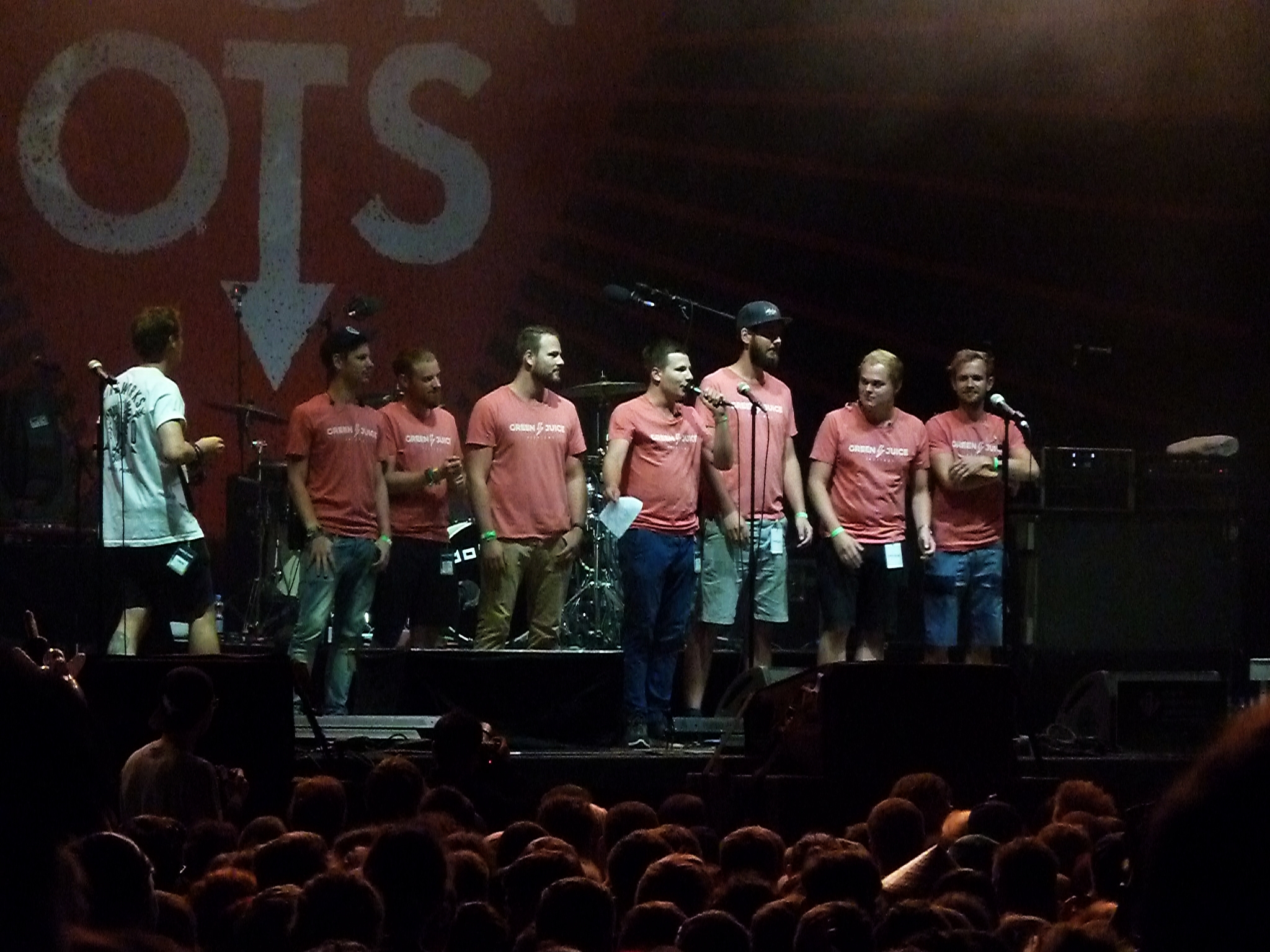 Meine Güte, was versprühen sie eine gute Laune! Le Fly werfen Ska, Hip-Hop, Rock, Discofunk und nach eigener Bekundung auch ganz viel Schnaps in einen Topf und herauskommt „St. Pauli Tanzmusik“. Da nimmt man den bekennenden St. Pauli-Fans im eher FC Köln- und/oder Dortmund-lastigen Rheinland auch keine Fangesänge aus dem hohen Norden krumm. Im Gegenteil. 7000 wippende, springende und tanzende Green Juice-Fans genossen bei optimalen Temperaturen eine große Partyatmosphäre.