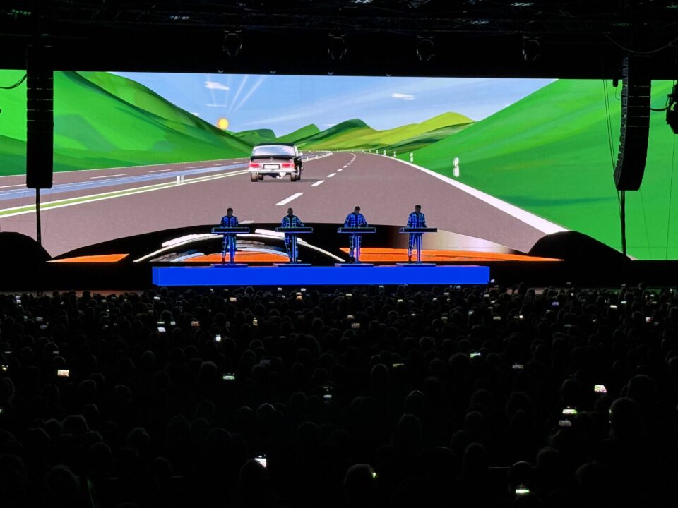 Die Elektro-Pop- und Techno-Pioniere um Gründungsmitglied Ralf Hütter sowie seinen Mitstreitern Henning Schmitz, Falk Grieffenhagen und Georg Bongartz liefern eine gut zweistündige Show voller visueller und klanglicher Impressionen. Sie entführen die rund 7000 Fans in ihr „Spacelab“, lassen Fliegende Untertassen über die gigantische Leinwand schweben, die bei der 3D-Show vor einigen Jahren natürlich noch effektvoller rüberkamen, versinken in die digitale Welt von Ätherwellen, wobei sich dann auch mal der Sound einer Kirchenorgel einschleicht, zeichnen uns die Welt voller Menschmaschinen („halb Wesen, halb Ding“), erscheinen selbst als verpixelte Männlein im „Electric Café“ und führen uns die heile Welt von einst auf den deutschen Autobahnen vor, als VW Käfer, Mercedes Benz mit Heckflosse, die „Knutschkugel“ Isetta und Citroën DS noch staufrei durch saubere und blühende Landschaften rollen konnten.