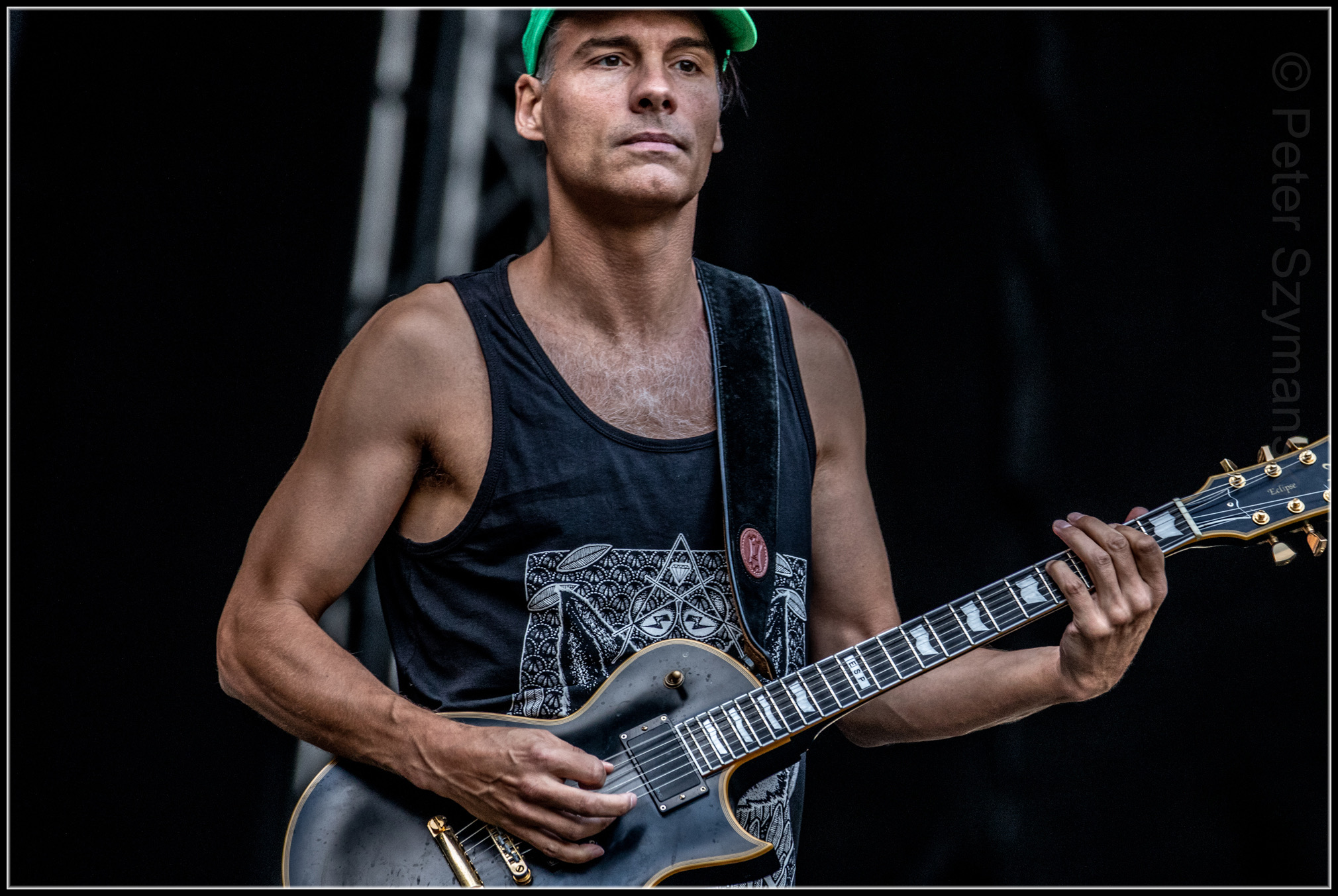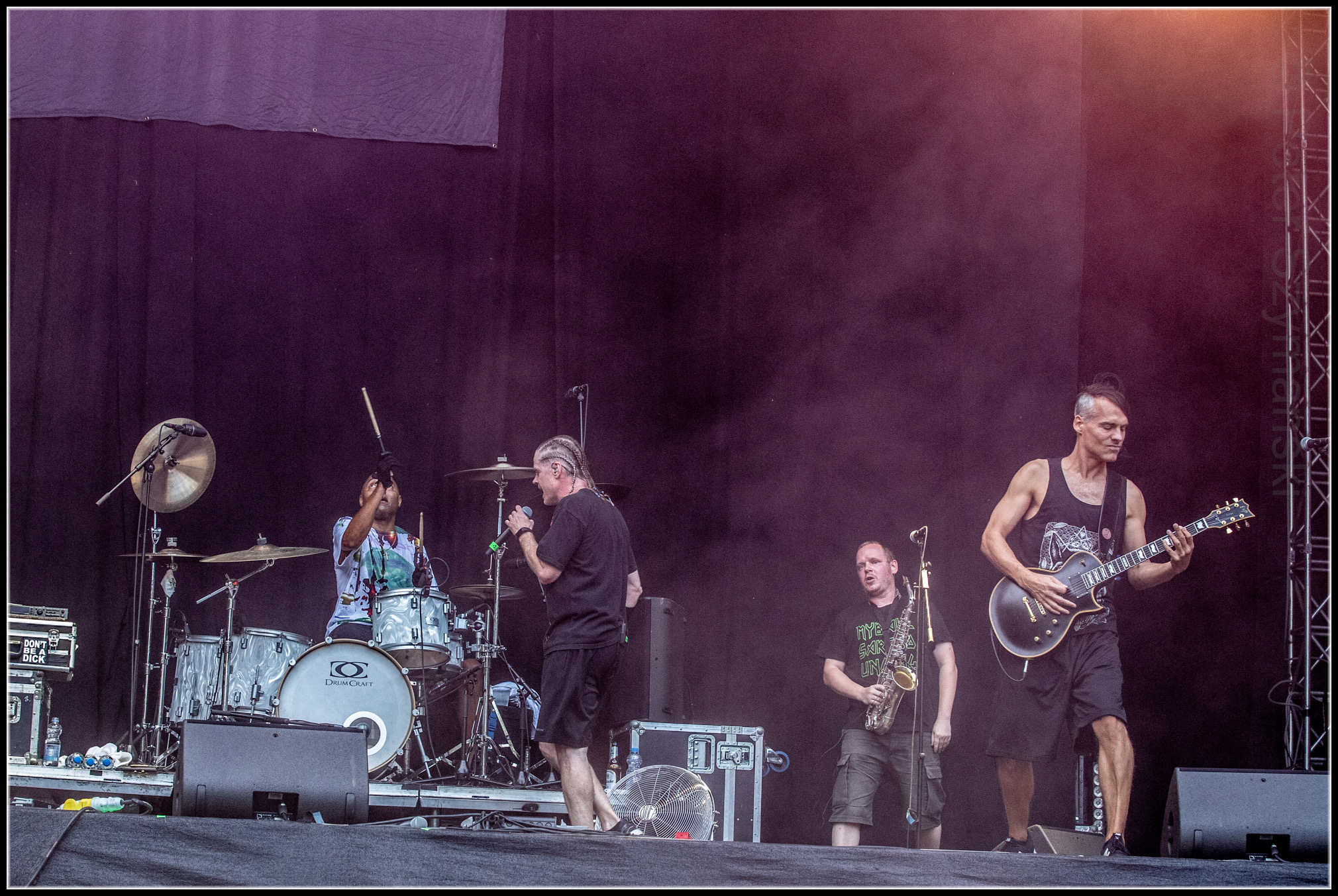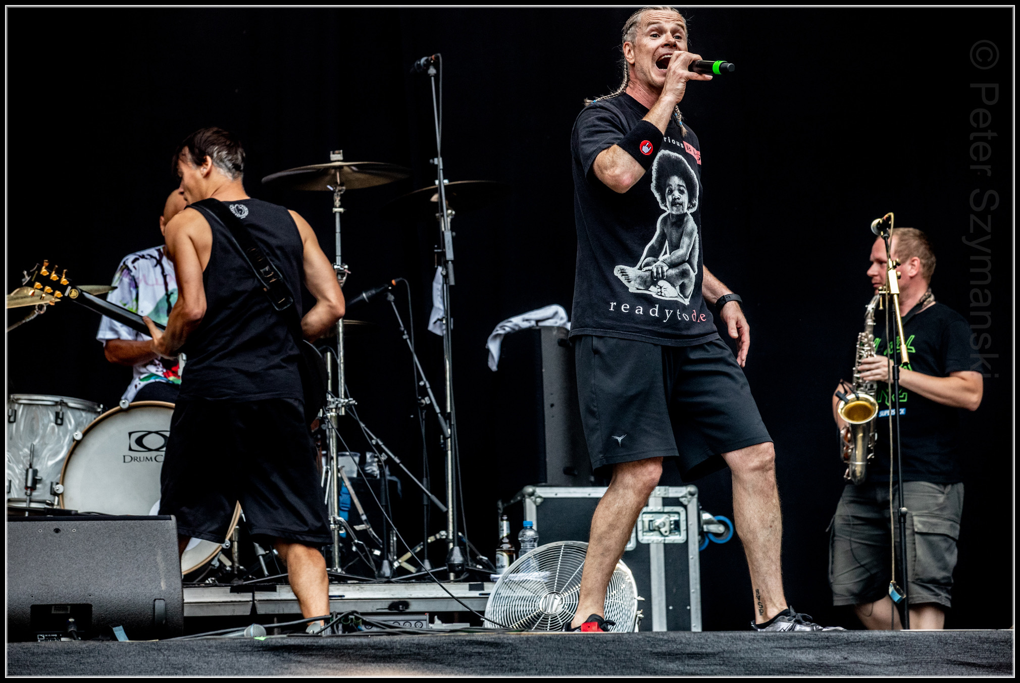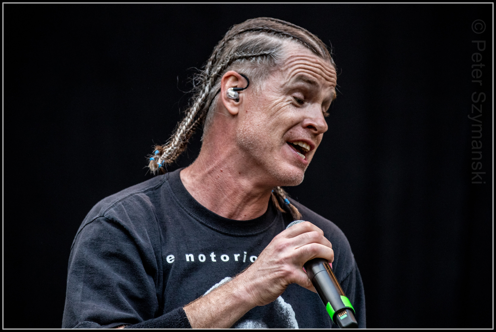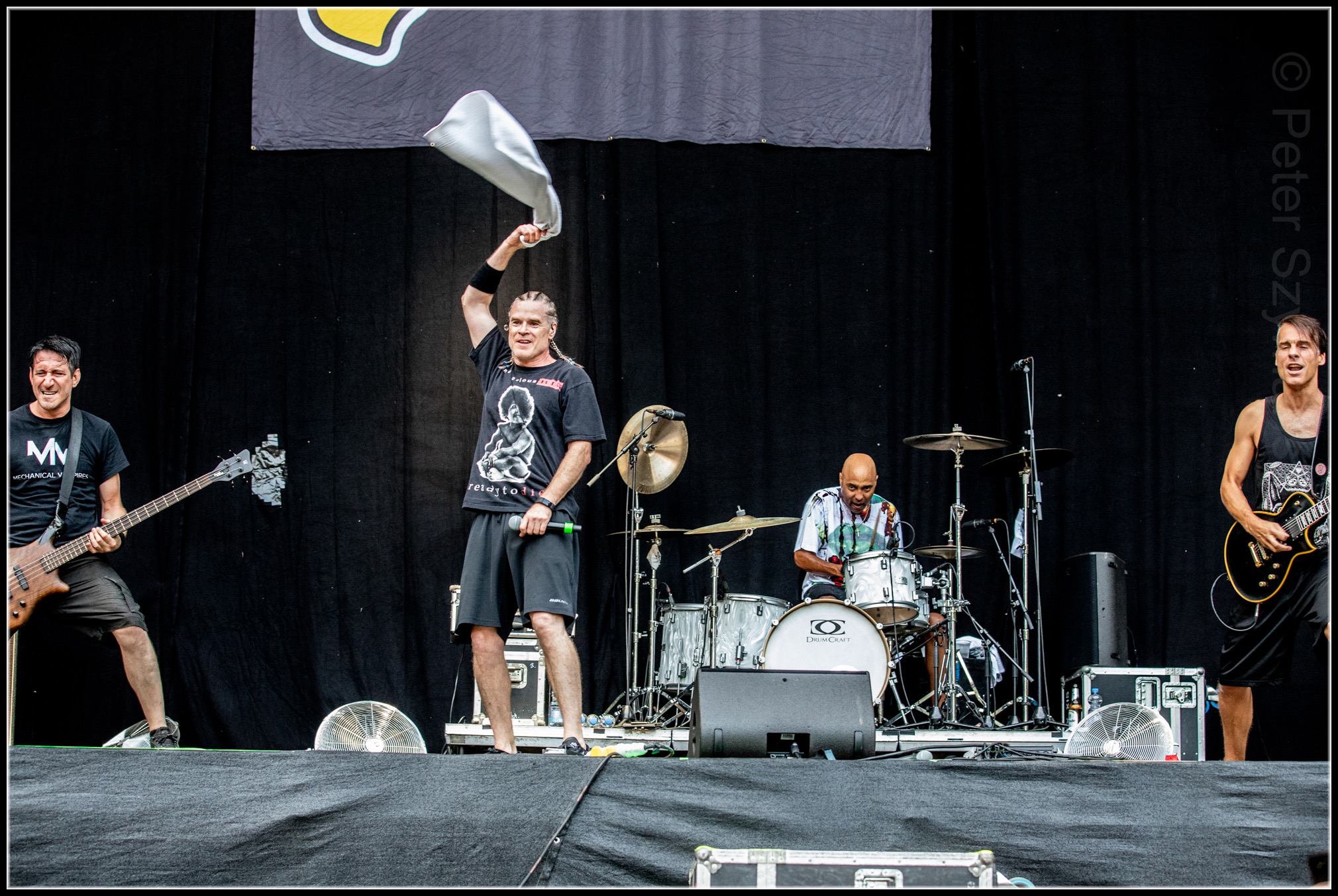Und dann kommt special guest Ra Díaz von Suicidal Tendencies auf die Bühne und übernimmt den Bass. Bei „Rocky“ kommt Bassist Dave Neabore zu seinem Soloeinsatz als Sänger. Er trägt den Italian Stallion-Boxermantel, während Connor den Weltmeistergürtel hochhält. Bei dem schnellen Kultsong bleibt wirklich niemand mehr auf dem Rasen unbeteiligt. Drummer Brendan Finley darf bei „Step right in“ nach vorne („Zicke Zacke Zicke Zacke…“) und rappt, was das Zeug hält. Bei „Expect the Unexpected“ ist die Stimmung eigentlich schon so gut, als wär Dog Eat Dog der Hauptact. Am Ende bedauert Connor noch den Abriss der Kölner Kultkonzertstätte Underground. „Peace! Respect!“ 19:44 Uhr ist alles vorbei. Geiler Auftritt.