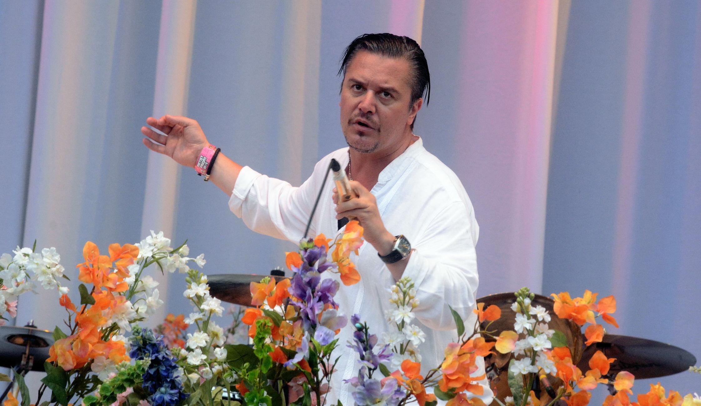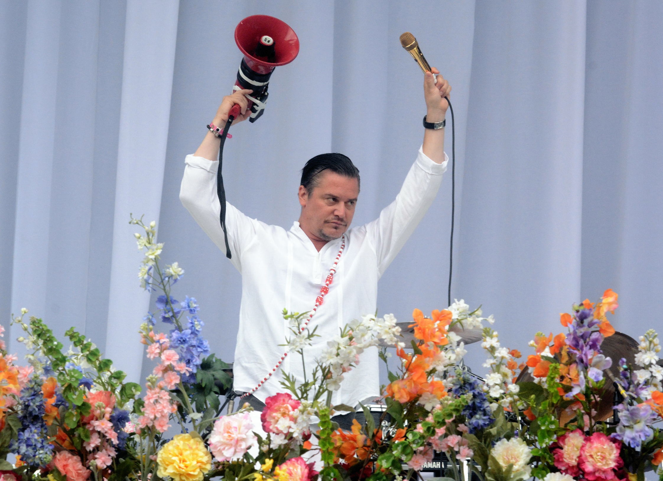 Zuvor hatte die Bühne noch Faith No More gefüllt. Sehr floral. Sehr Zenmäßig. Ganz in Weiß, mit Perlenketten – fast wie Sannyasins des Rock standen Mike Patton und die übrige Truppe da inmitten der üppigen Blumengebinde auf der Bühne. Wer das Kalifornische Quitett, das wie kaum eine andere Rockband für grenzenlose Verschmelzungen der Genres steht, in München bei der Rockavaria oder in Gelsenkirchen gesehen hatte, wäre schwer überrascht gewesen.