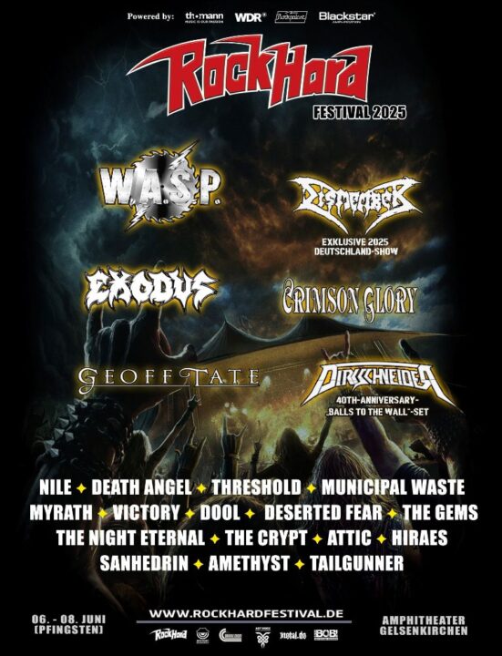 Wie in den Vorjahren hat die ROCK HARD-Redaktion ein hervorragendes Programm mit 22 internationalen Top-Acts zusammengestellt, darunter W.A.S.P., GEOFF TATE, EXODUS und CRIMSON GLORY. Mit Spannung werden die Auftritte von DISMEMBER (exklusive 2025er Deutschland-Show) und Udo DIRKSCHNEIDER (40th Anniversary „Balls To The Wall“-Set) erwartet. Ansonsten geben sich die heißesten Newcomer aus der internationalen Szene wie AMETHYST, MYRATH, THE NIGHT ETERNAL oder THE CRYPT die Mikrofonkabel in die Hand. Hier die Running Order für die einzelnen Tage: