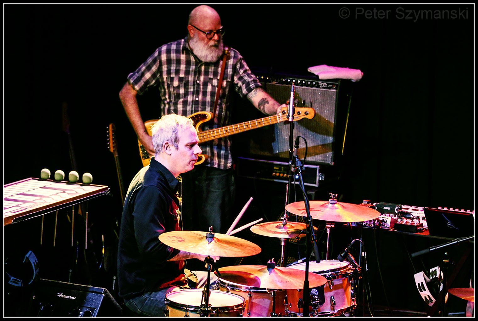 Der Bass steht oft wie ein fester Pflock, wie ein Totempfahl im Zentrum der Musik, um den das Tonreich von Tortoise tanzt. Und dieser fette Bass von Doug McCombs mit seinen oft sehr intensiven Melodien kommt in der Bonner Harmonie wunderbar zur Geltung. Der Sound der legendären Post-Rocker aus Chicago war hervorragend. Das etwa anderthalbstündige Konzert sowieso.