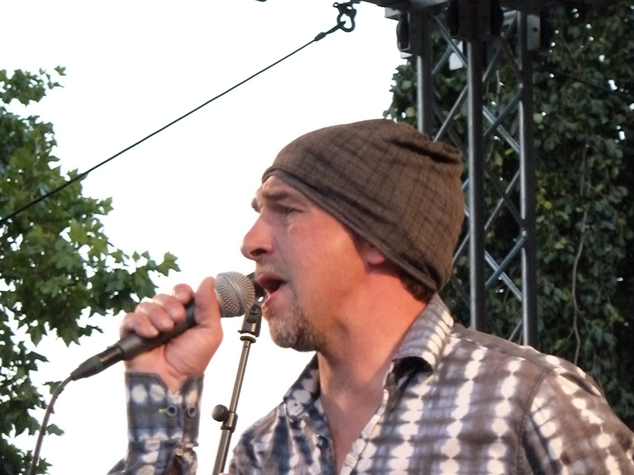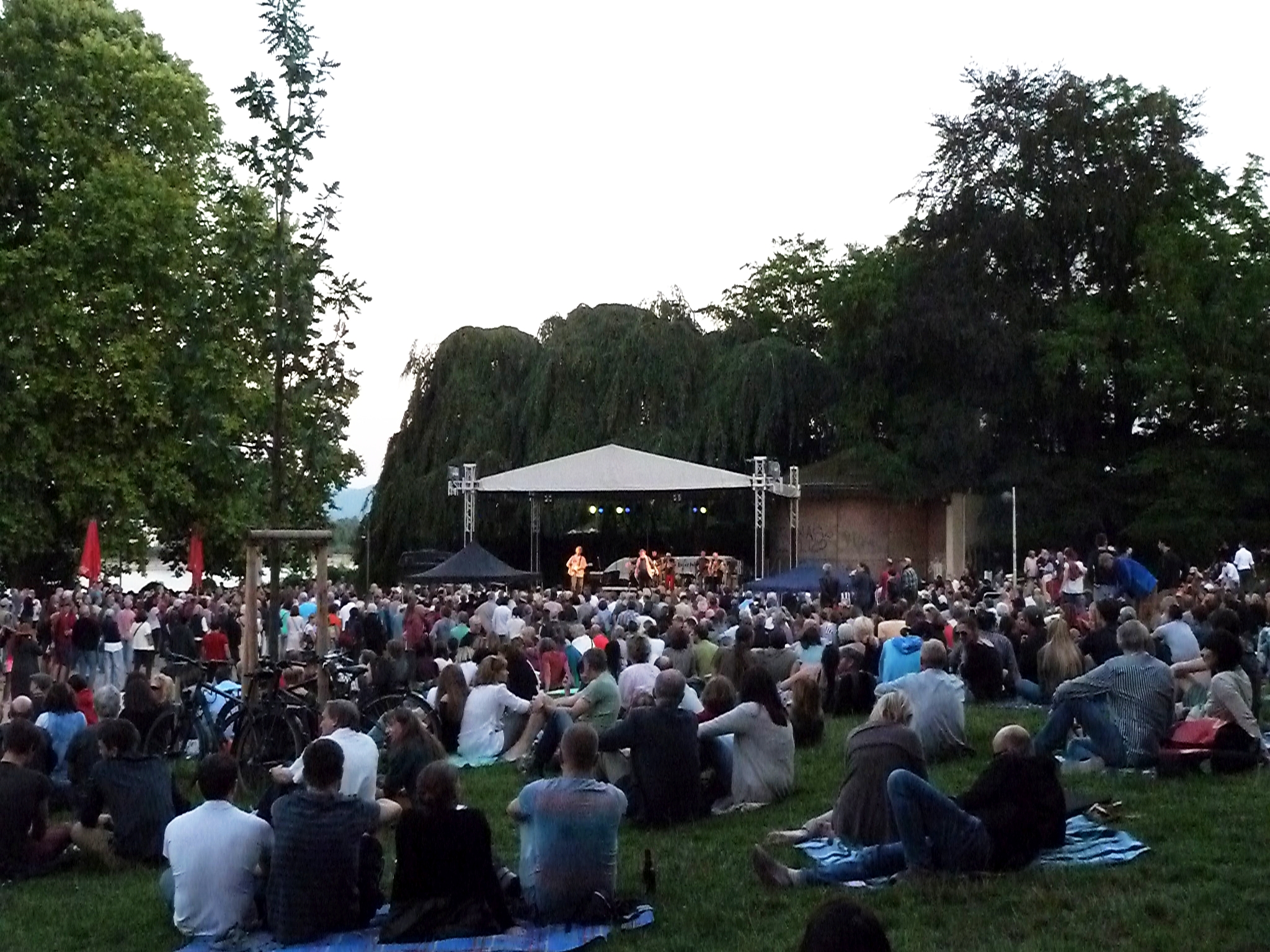Was für eine Atmosphäre! Der Biergarten nebenan ist gut gefüllt (was einen bei der Qualität der Speisen ehrlich gesagt etwas verwundert…. Aber was soll’s! Ganz anderes Thema!), der Platz vor der Bpühne und die Wiese des Stadtgartens sind ebenfalls ordentlich belegt. Auf der Wiese herrscht entspannte Stimmung, wie man es eben auch noch aus den 60er und 70er Jahren von Open-Air-Konzerten gewohnt war, als man die Musik bequem rumfläzend genossen hat und sich nicht stundenlang die Füße plattstehen musste. (auch ein anderes Thema!).