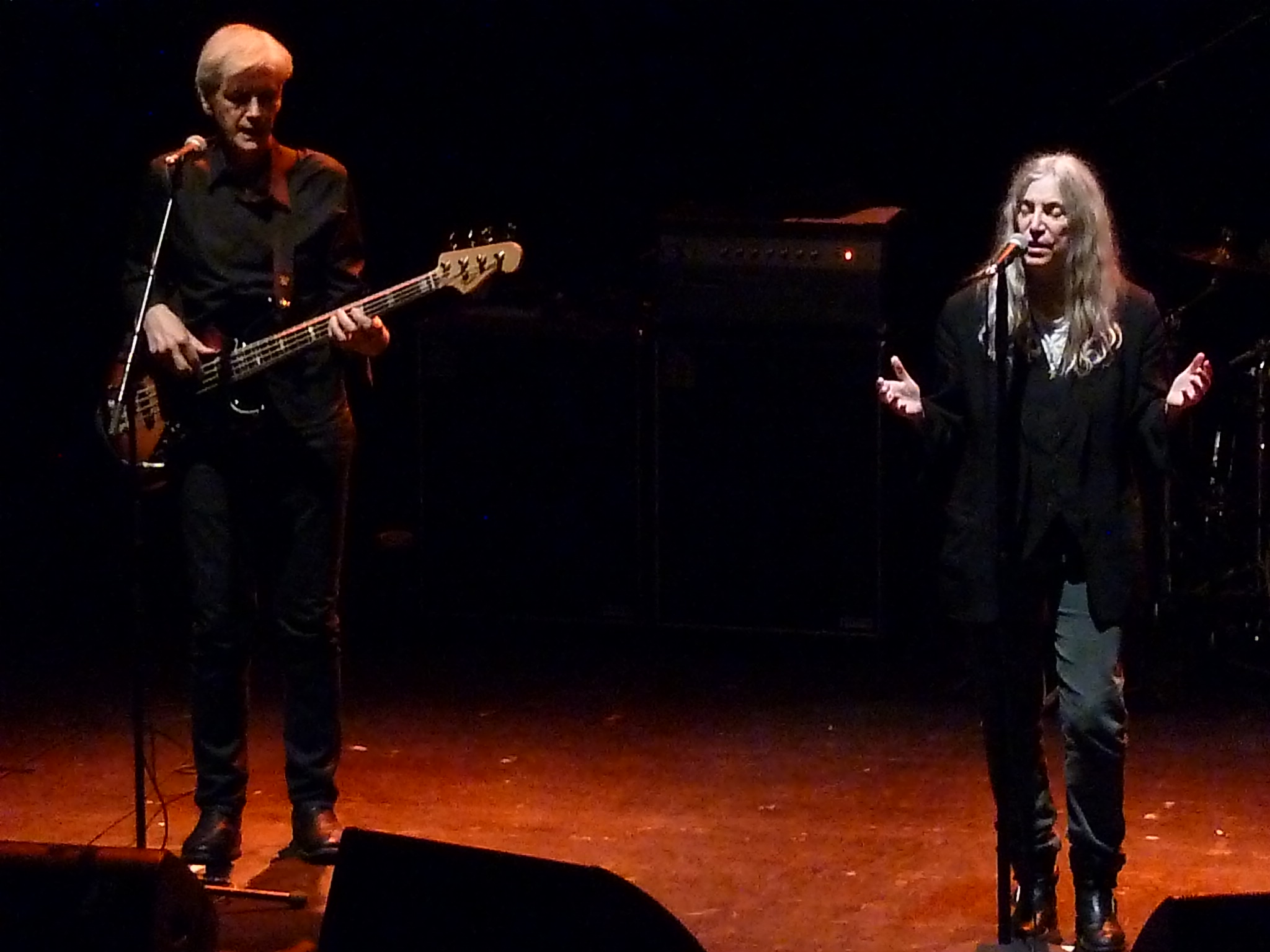 Die ersten stehenden Ovationen gibt es bei „Ghost Dance“. Der Rhythmus stampfender, die Trommeln entrückt wie bei einem indianischen Pow-Wow , ein eindringliches Mantra. „Shake out the ghost – dance.“ Für mich einer der Höhepunkte: „Birdland“. Ein unglaublicher Text! Vom Album „Horses“. Der Text basiert wohl auf den Memoiren von Peter Reich („Book Of Dreams“), Sohn des Psychoanalytikers Wilhelm Reich. Es geht um den quälenden Prozess des Erwachsenwerdens, über lange verdrängte Erinnerungen, die neu über einen einstürzen, ums Befreien vom Schatten eines übergroßen Vaters, darum sein eigenes Leben leben zu können. Das hatte in diesem Kontext mit „Sonic“ Smiths Sohn in der Band etwas sehr intensives, wie Patti Smith die Worte buchstäblich ausspuckt, ein Song, irgendwo zwischen packendem Sprechtheater und düsterem Prediger-Rap.